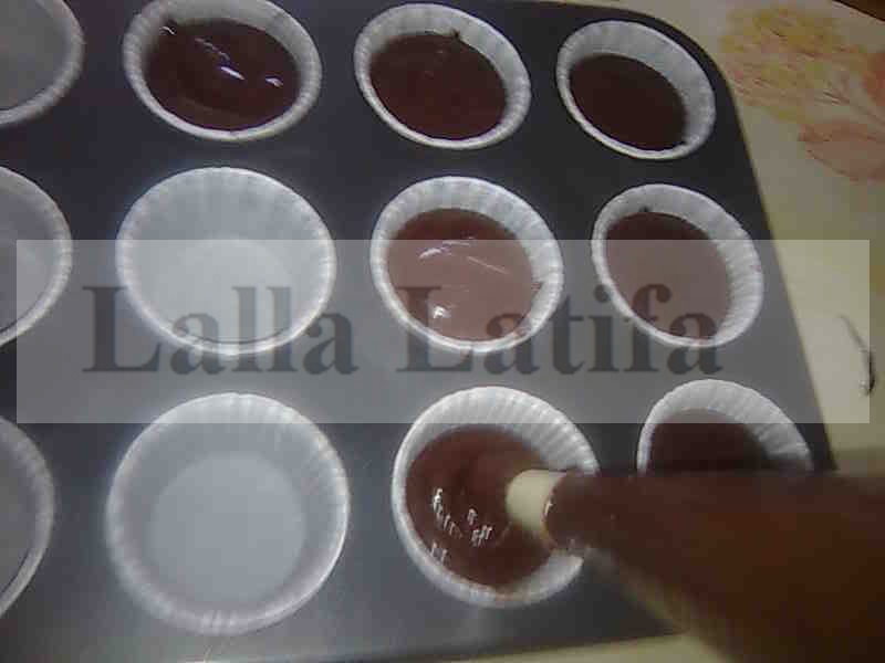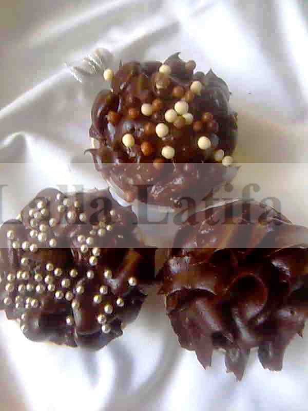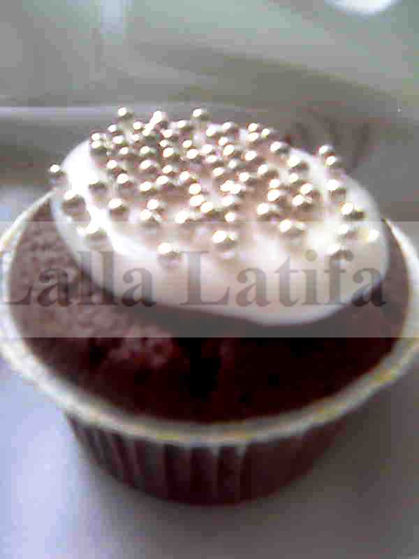 - Soit avec la ganache noire : porter à l’ébullition 100gr de crème fraîche spécial cuisson, hors feu ajouter150gr de chocolat noire riche, bien tourner avec la cuillère en bois, une fois la préparation tiédie incorporer 20gr de beurre doux à l’ensemble. Puis mettre la ganache dans une poche pâtissière munie d’une douille et faire de beaux motifs sur chaque gâteau selon votre choix, saupoudrer dessus du chocolat vermicelle ou des perles ou encore des paillettes spéciales pâtisserie qu’on trouve dans le commerce.