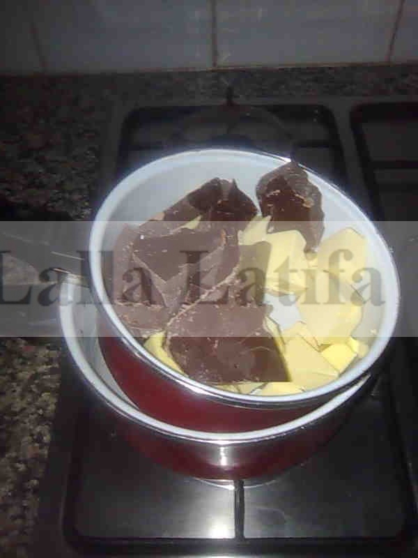 Faire fondre le beurre et le chocolat au bain marie. Laisser tiédir.