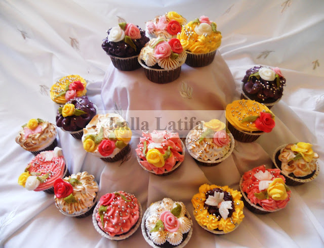 Confectionner des fleurs de différente couleur et des feuilles vertes, puis posez-les sur les cupcakes