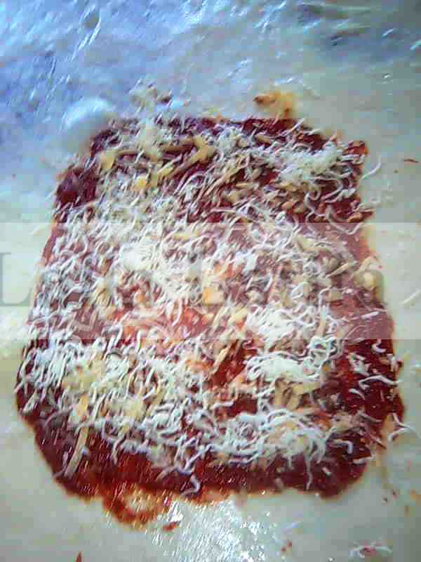 Etaler sur ce centre de la pâte le 1/3 de la sauce à pizza et le 1/3 du mélange des 3 fromages.