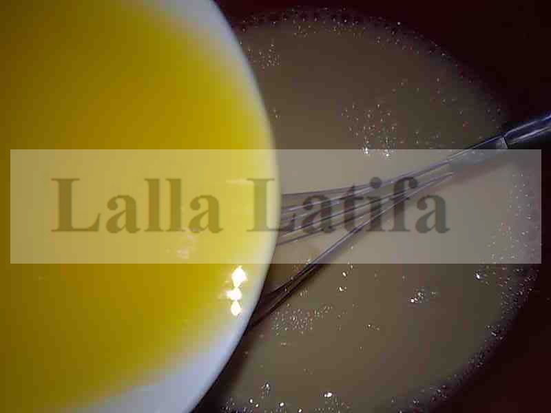 Dans un récipient, fouetter un peu les œufs et ajouter le lait et le beurre doux fondu tout en remuant.