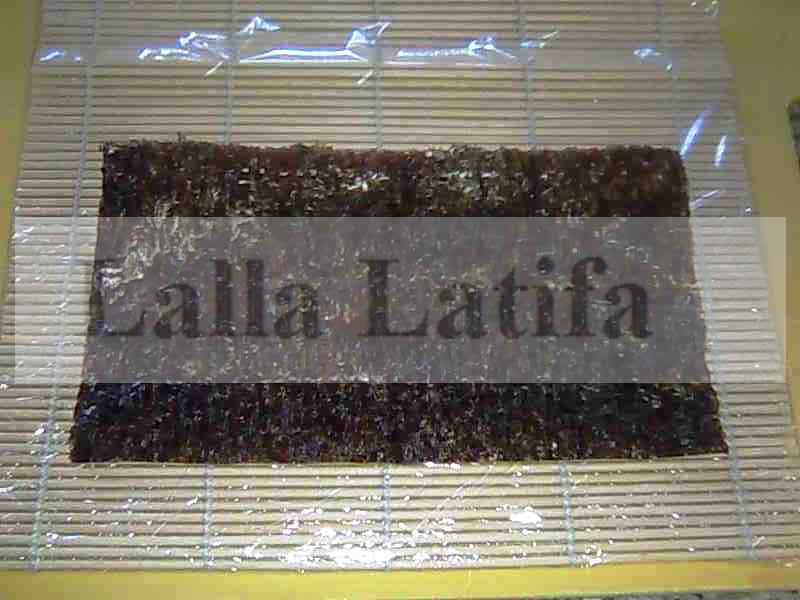 Sur le tapis à sushi, poser une ½ feuille d’algues.