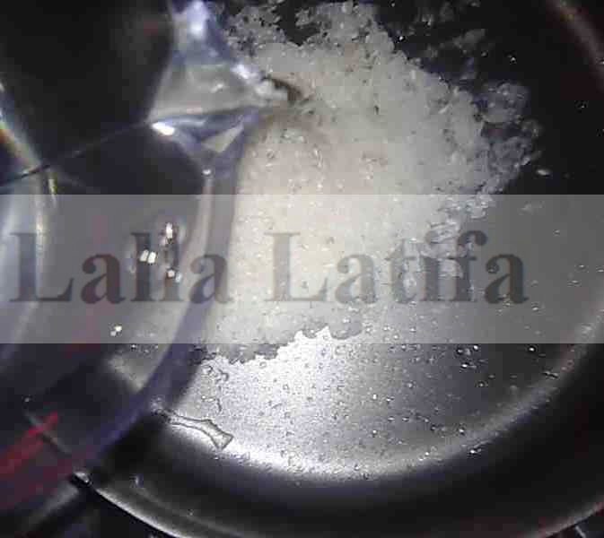 Mettre le riz dans une poêle antiadhésive avec un couvert transparent. Ajouter 300 ml d’eau. Egaliser la surface du riz. Mettre le couvercle.