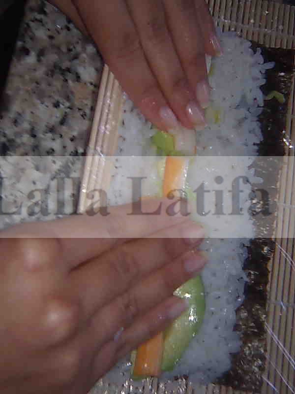 Enrouler l’ensemble en vous aidant du tapis tout en appuyant avec les doigts pour bien coller le maki.