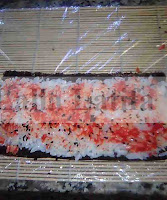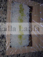 Sur le tapis à sushi, poser une ½ feuille d’algues. Étaler en appuyant une bonne couche de riz. Laisser une marge à la partie supérieure pour faciliter la fermeture du California Roll.(ne pas oublier de tremper les mains dans l’eau+ vinaigre de riz)