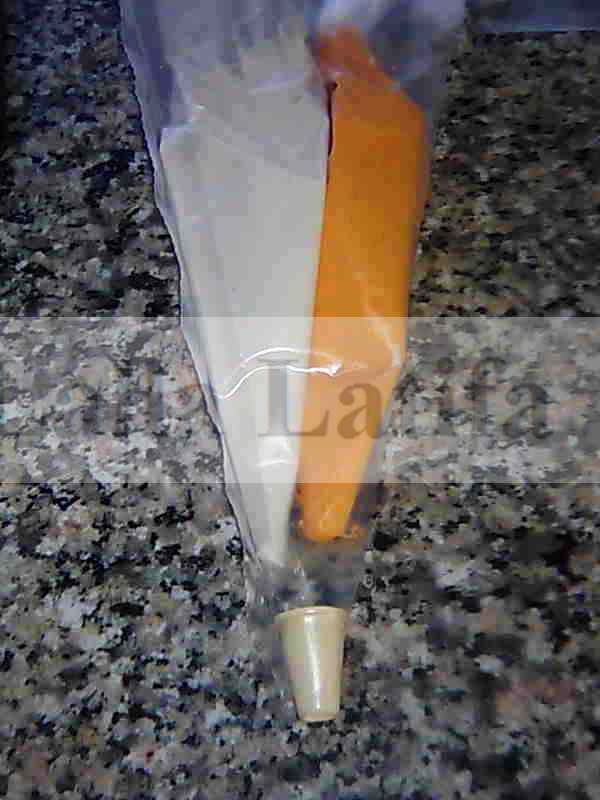 Mettre les deux mélanges dans deux poches différentes et façonner quelques coques oranges et blancs,