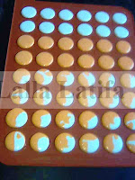 Mettre les deux mélanges dans deux poches différentes et façonner quelques coques oranges et blancs,