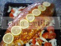 Poser le poisson sur les tomates et les oignons. Ajouter la marinade.