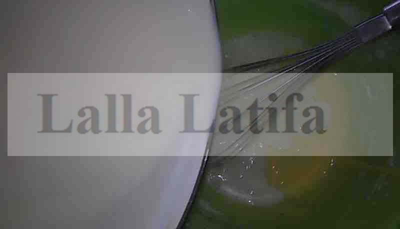 Verser petit à petit le lait bouilli sur la préparation précédente tout en tournant au fouet.