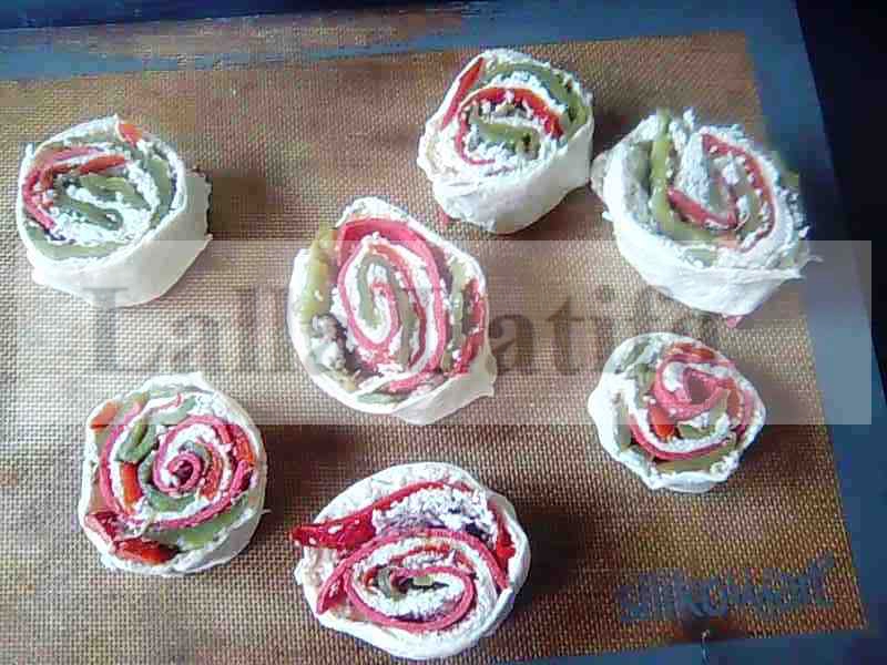 Parsemer un peu de mozzarella puis une couche de poivron rouge et couvrir de mozzarella suivie d’une couche de poivron vert, couvrir de mozzarella