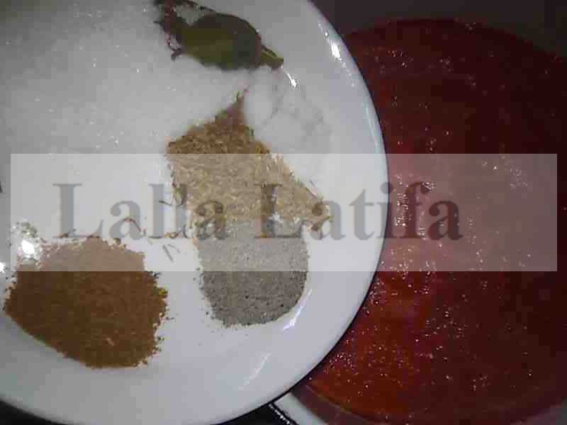 Mettre à cuire 30 minutes à feu moyen,  dans une casserole avec le sel, le poivre, le cumin, le thym, les feuilles de laurier, sucre et l’huile d’olive