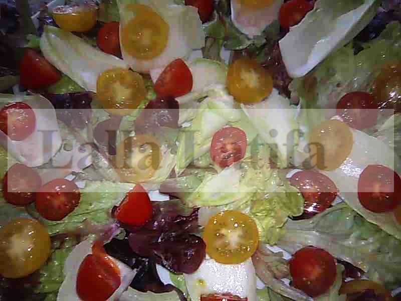 Laver et sécher la salade et l’endive et couper en gros dés les rondelles d’ananas.