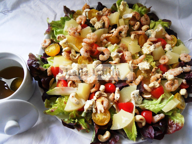 Disposer sur un plat de service les feuilles de la salade et de l’endive. Mettre dessus d’une façon uniforme les tomates et les dés d’ananas, le bleu et les crevettes. Enfin ajouter l’acajou grillé juste avant de servir pour qu’il reste croustillant.
