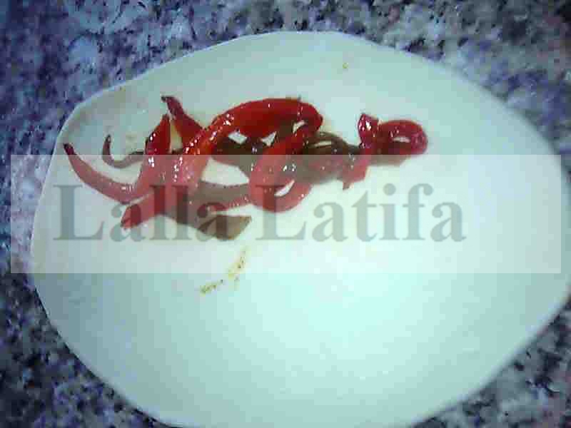 Faire cuire les poivrons coupés en lamelle dans un peu d’huile d’olive, sel et poivre