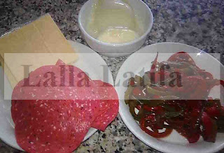 Mettre sur un côté la pâte un peu de poivrons cuits, un peu de salami , de mozzarella et fromage édam.